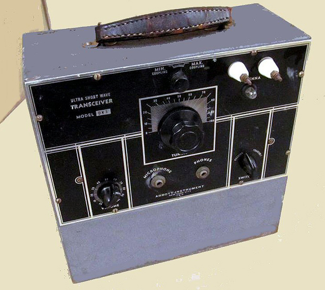 The museum recently acquired this rare Abbott Industries DK-3, 2-1/2 meter tuned oscillator transceiver which dates to the early years of World War-II. First introduced in 1939, this device was ideal for early service on the war front because of it's high frequency line-of-site capabilities. Today, operation of tuned oscillator transmitters is prohibited by the FCC, and also this set falls within the present frequency range of a commercial aircraft band, so it can't legally be placed on the air. It is, however, an excellent example of the progress that had been made, prior to WW-II, in the then experimental VHF realm, and how that emerging technology was readily adapted for Wartime service. An ad from a WW-II era QST magazine is displayed below, giving the specifications of the DK-3. Interestingly, the unit above also bears a label indicating that it once was the property of WHHI, a commercial broadcast radio and television station based in Hilton Head, SC. The museum is currently attempting to learn more about the post-war history of this piece of equipment. |