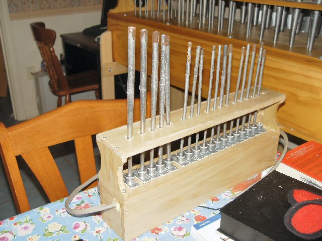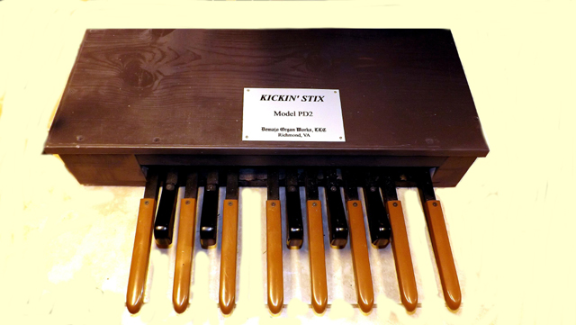 *** NEW PRODUCTS*** "KICKIN' STIX" Model PD-2 virtual organ pedal system for use with Hauptwerk, Jorgan or other Midi organ systems and controls. Built in MIDI interface Programmable output from Midi Channel 1-16 13, 25 or 32 note versions available Includes 32 additional built-in inputs to accept toe studs, expression and crescendo pedals or other dry contact devices. |